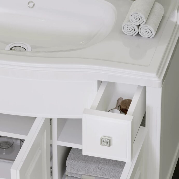Элегантность и роскошь мебельного гарнитура Opadiris Лаура 100, укомплектованного раковиной-столешницей из литьевого мрамора, приведут в восторг даже самого искушённого пользователя. Изготовленный из массива бука, комплект имеет два предмета – навесное зеркало в раме и напольную умывальную тумбу на ножках среднего размера. Изделия окрашены влагостойкой белой эмалью и украшены стильной хромированной фурнитурой с кристаллами Swarovski. Такое сочетание удачно сочетается с общей стилистикой дизайна классической мебели.