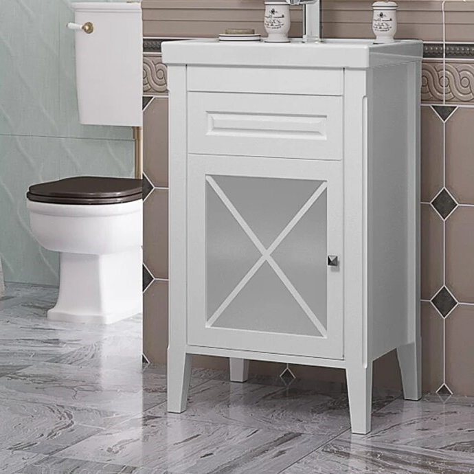 Мебель для небольших ванных комнат в классическом стиле – Opadiris Палермо 50, выполнена в элегантном белом цвете и оформлена матовым стеклом с геометричным декором. В состав комплекта входят подвесное прямоугольное зеркало в раме с карнизом и компактная тумба на ножках, оборудованная раковиной с глубокой чашей из керамики. Для хранения производитель предусмотрел наличие распашного фасада и выдвижного ящика с нажимным механизмом открывания.