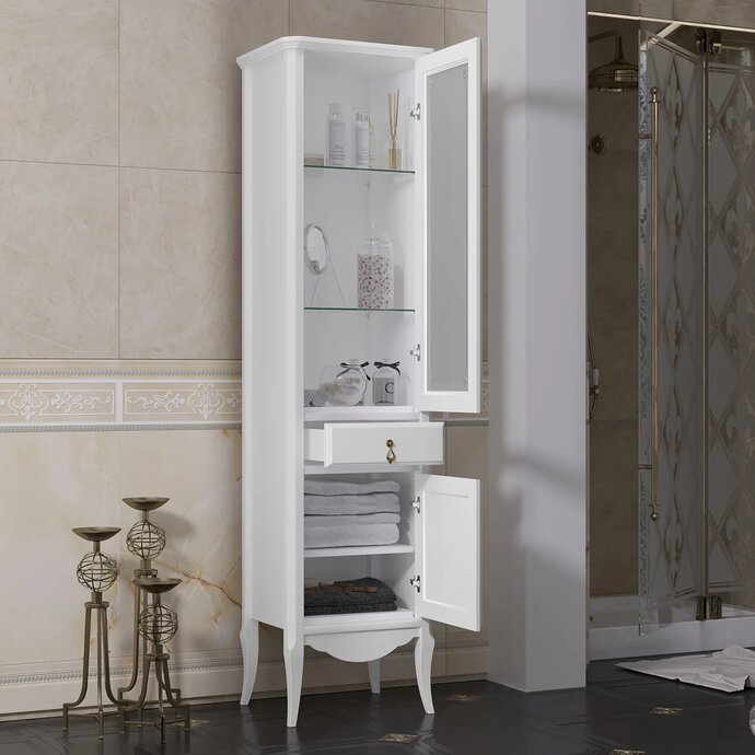 Эстетика и традиции классического дизайна представлены в элегантном пенале Opadiris Лоренцо 45 в матовом белом цвете отделки. Фигурный карниз, изогнутые ножки и стильные бронзовые ручки дополняют образ, делая его более гармоничным и совершенным. Молочное стекло с красивым выгравированным рисунком украшает фасад изделия. Также в модели предусмотрен небольшой выдвижной ящик для хранения всевозможных мелочей и средств ванной принадлежности. Петли на дверках расположены с правой стороны.